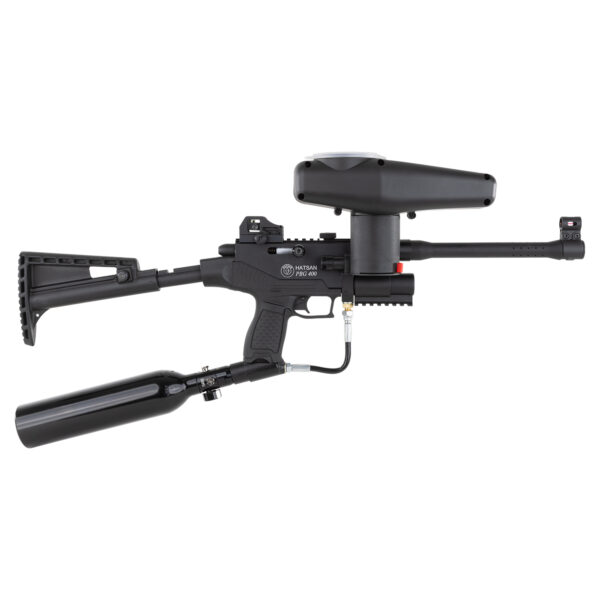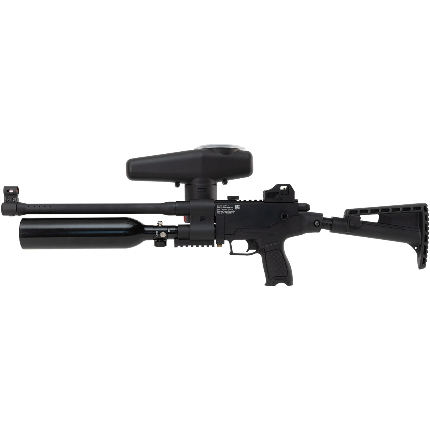 Both models include a 200-round hopper, adjustable fiber optic sights, a telescoping buttstock, and a vertical fore-grip for improved handling and stability. The PBG 400 utilizes a rear-mounted air cylinder paired with a compact 10-inch barrel, creating a lightweight, maneuverable configuration ideal for close-quarters play. The PBG400F features a front-mounted air cylinder and longer 13.75-inch barrel, offering enhanced balance and a more traditional paintball marker feel.